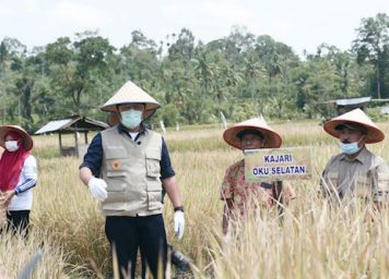 OKUS – Gubernur Sumsel H.Herman Deru melakukan Panen Raya Padi Sawah Varietas Mikongga bersama para petani di Desa Surabaya Kecamatan Banding Agung Kabupaten OKU Selatan, Selasa (12/10/20).