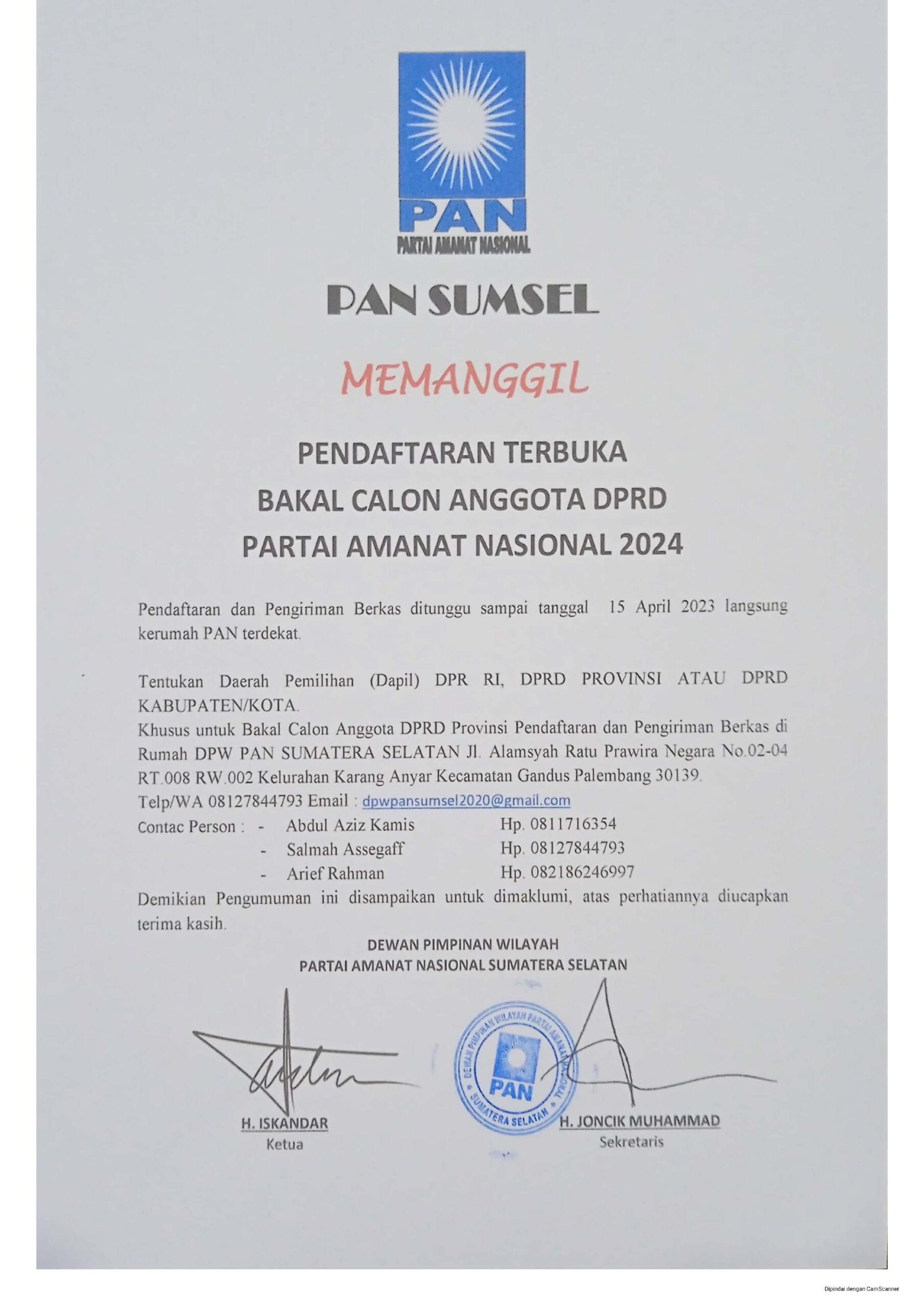 Dewan Perwakilan Wilayah (DPW) Partai Amanat National (PAN) Sumatera Selatan (Sumsel) membuka pendaftaran bagi seluruh bakal calon anggota DPRD Sumsel dan Kabupaten/Kota yang ingin maju dalam pemilihan legislatif tahun 2024. Berkas kelengkapan ditunggu sampai tanggal 15 April 2023 dan dikirim langsung ke rumah PAN terdekat. Bagi calon anggota legislatif DPRD Provinsi, pendaftaran dan pengiriman berkas di kirim ke Rumah DPW PAN Sumsel, Jl. Alamsyah Ratu Prawira Negara No.02-04 RT. 008 RW. 002 Kelurahan Karang Anyar Kecamatan Gandus Palembang.
