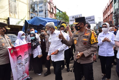 Mereka datang bersamaaan kemudian berpencar mendatangi pedagang dan pengunjung yang belum menggunakan masker. Sambil membagikan masker, Wagub Mawardi Yahya juga tampak beberapa kali memperingatkan warga yang kedapatan lupa mengenakan masker.