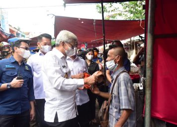 “Iya hari ini kita sosialisasi masker ke pasar-pasar. Kita turun langsung agar disiplin masyarakat menjaga Prokes tetap tidak kendor,” ucap Wagub Mawardi sesaat usai bagi-bagi masker.